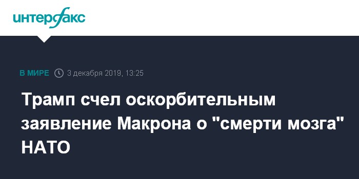 Москва. 3 декабря. INTERFAX.RU - Президент США Дональд Трамп назвал оскорбительным заявление президента Франции Эммануэля Макрона о том, что из-за снижающейся поддержки со стороны США альянс находится в стадии "смерти мозга". Ранее издание Axios сообщало со ссылкой на чиновников в Белом доме, что Трамп разозлился на Макрона за эти слова.