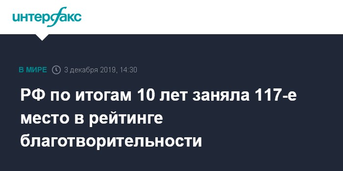 Москва. 3 декабря. INTERFAX.RU - Россия по итогам десяти лет исследований заняла 117-е место в рейтинге частной благотворительности (World Giving Index) из 126 стран, показывающем, насколько часто граждане отдельных государств делают пожертвования, помогают нуждающимся и занимаются волонтерством, говорится в публикации благотворительного фонда Charities Aid Foundation.