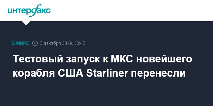 Москва. 3 декабря. INTERFAX.RU - Первый пробный запуск новейшего американского корабля Starliner к Международной космической станции (МКС), планировавшийся на 17 декабря, отложен на два дня в связи с возникшими проблемами у ракеты-носителя Atlas 5, сообщила компания-оператор United Launch Alliance (ULA).