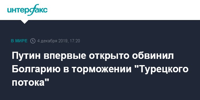 Москва. 4 декабря. INTERFAX.RU - Ход работ на территории Болгарии по продолжению газопровода "Турецкий поток", который раньше был только предметом рутинных экономических новостей, впервые получил жесткую политическую оценку президента России Владимира Путина.