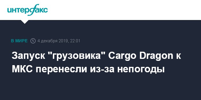 Москва. 4 декабря. INTERFAX.RU - В связи с неблагоприятными погодными условиями в районе космодрома запуск грузового космического корабля Cargo Dragon к Международной космической станции (МКС), планировавшийся в среду, перенесен на сутки, сообщило Национальное управление США по аэронавтике и исследованию космического пространства (NASA).