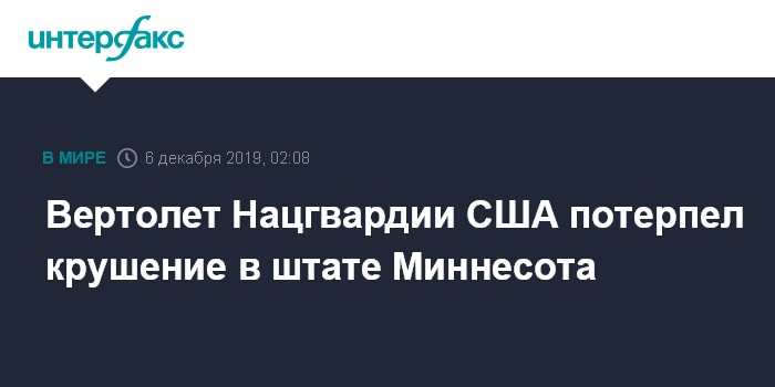 Москва. 6 декабря. INTERFAX.RU - Вертолет Национальной гвардии Миннесоты UH-60 Black Hawk потерпел крушение к югу от города Сент-Клауд, сообщает The St. Cloud Times.