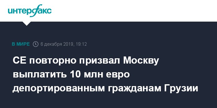 Москва. 6 декабря. INTERFAX.RU - Комитет министров Совета Европы (СЕ) в пятницу призвал Россию немедленно выплатить депортированным в 2006 году из РФ гражданам Грузии компенсацию в размере 10 миллионов евро.