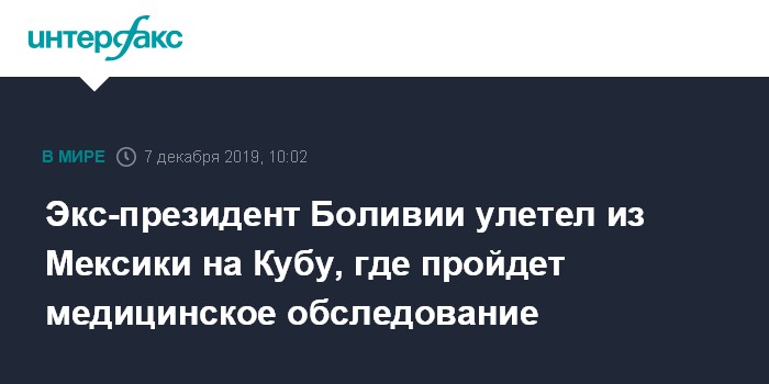 Москва. 7 декабря. INTERFAX.RU - Экс-президент Боливии Эво Моралес вылетел на Кубу из Мексики, которая предоставила ему политическое убежище, сообщает мексиканская газета "Универсаль".