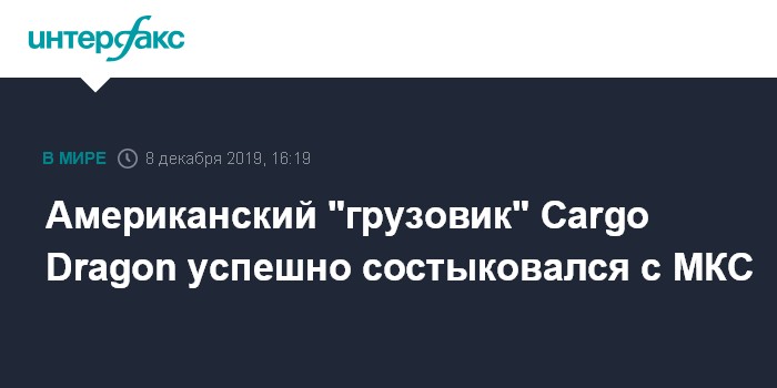 Москва. 8 декабря. INTERFAX.RU - Выведенный на орбиту американский грузовой космический корабль Cargo Dragon компании SpaceX в воскресенье успешно состыковался с Международной космической станцией (МКС), сообщило Национальное управление США по аэронавтике и исследованию космического пространства (НАСА).
