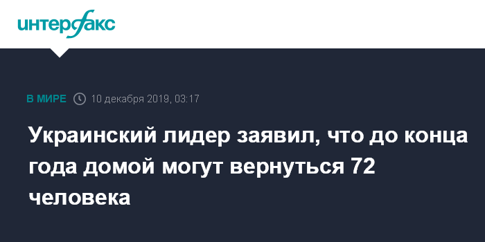 Москва. 10 декабря. INTERFAX.RU - 72 человека могут вернуться домой до конца года в рамках договоренностей об обмене удерживаемыми лицами, достигнутыми на саммите "Нормандской четверки" в Париже, заявил президент Украины Владимир Зеленский.