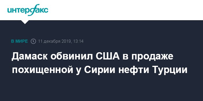 Москва. 11 декабря. INTERFAX.RU - Соединенные Штаты совершили "вооруженное покушение" на сирийские территории с целью захвата нефтяных месторождений, Вашингтон продает похищенную у Сирии нефть Турции, утверждает постпред Сирийской Арабской Республики (САР) при ООН Башар Джаафари.