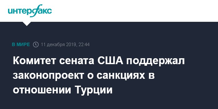 Москва. 11 декабря. INTERFAX.RU - Комитет по международным делам сената США в среду принял законопроект по введению санкций в отношении Турции из-за турецкой военной операции в Сирии и приобретения российских ЗРС С-400.