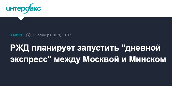 "Задача такая, чтобы за 6 часов, днем, в комфортабельных условиях сообщение между Минском и Москвой мы (запустили - ИФ)", - заявил телеканалу начальник БЖД Владимир Морозов. Запустить "дневной экспресс" планируется к декабрю 2020 года, добавил он.