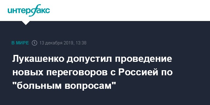 10 декабря Лукашенко говорил, что рассчитывает до конца 2019 года встретиться с Путиным, а также с премьер-министром РФ Дмитрием Медведевым, чтобы окончательно расставить точки над "i" по важнейшим вопросам интеграции двух стран.