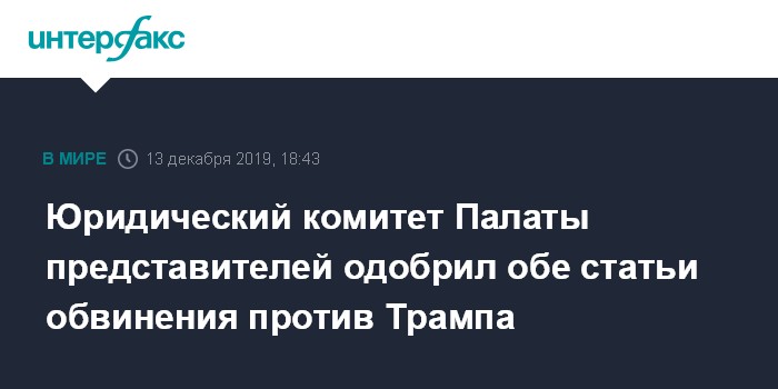 Москва. 13 декабря. INTERFAX.RU - Юридический комитет Палаты представителей Конгресса США утвердил два пункта обвинений, выдвинутых в отношении президента Дональда Трампа.