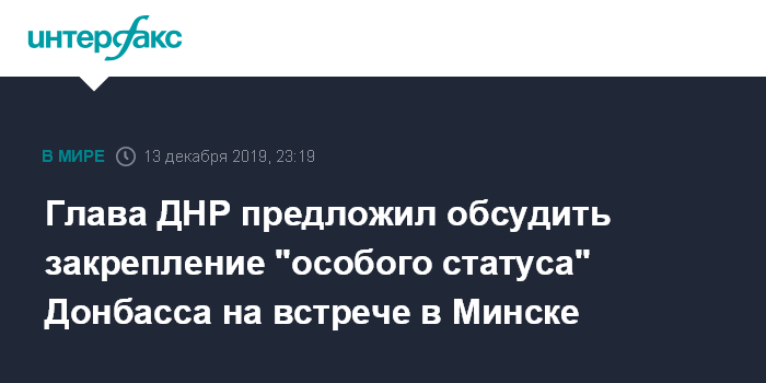 Москва. 13 декабря. INTERFAX.RU - В самопровозглашённой Донецкой народной республике (ДНР) предлагают обсудить поправки в украинскую Конституцию с закреплением "особого статуса" Донбасса на встрече 18 декабря в Минске, говорится в заявлении главы ДНР Дениса Пушилина, распространенном его пресс-службой.