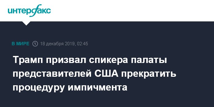 Москва. 18 декабря. INTERFAX.RU - Президент США Дональд Трамп в своем письме спикеру Палаты представителей Нэнси Пелоси призвал прекратить процедуру импичмента, а также обвинил демократов в "беспрецедентном и неконституционном превышении полномочий".