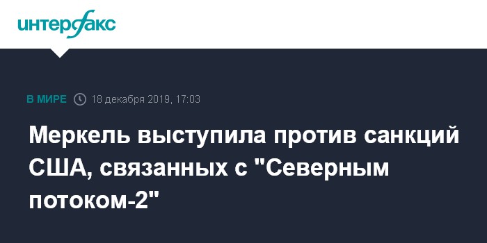 Москва. 18 декабря. INTERFAX.RU - ФРГ выступает против экстерриториальных санкций, которые США собираются ввести из-за "Северного потока-2", заявила канцлер Германии Ангела Меркель.