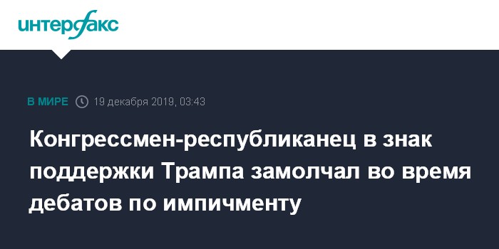 Москва. 19 декабря. INTERFAX.RU - Член палаты представителей от республиканцев Расс Фулчер избрал необычную тактику для защиты президента США Дональда Трампа во время слушаний по импичменту: он замолчал во время своего выступления.