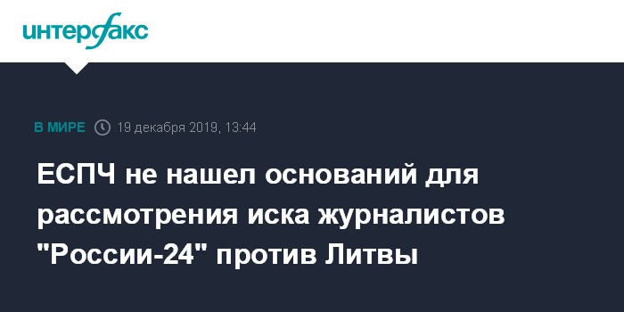 Москва. 19 декабря. INTERFAX.RU - Европейский суд по правам человека пришел к выводу, что не имеет достаточных оснований, чтобы принять иск, поданный против Литвы четырьмя сотрудниками телеканала "Россия-24".