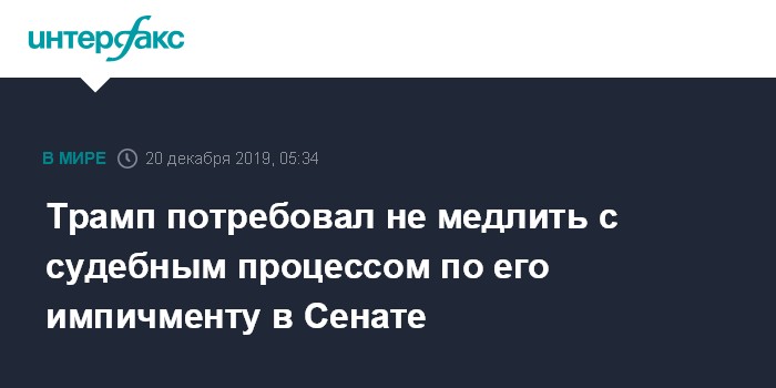 Москва. 20 декабря. INTERFAX.RU - Президент США Дональд Трамп потребовал не откладывать судебный процесс в Сенате и провести его немедленно, соответствующее заявление он разместил в своем твиттере.