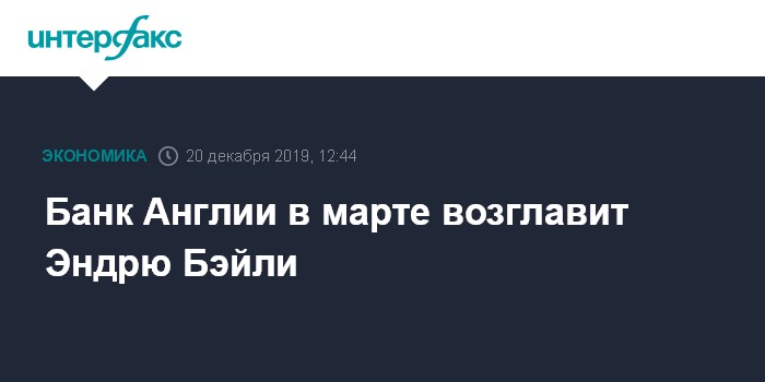 Москва. 20 декабря. INTERFAX.RU - Руководителя Банка Англии Марка Карни 16 марта 2020 года сменит нынешний глава Управления по контролю за соблюдением норм поведения на финансовых рынках (Financial Conduct Authority, FCA) Эндрю Бэйли. Елизавета II одобрила это назначение, сообщила пресс-служба регулятора.