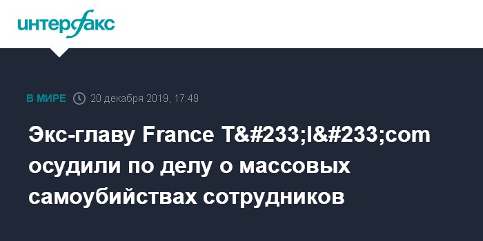 Москва. 20 декабря. INTERFAX.RU - Суд во Франции вынес приговор бывшему генеральному директору и президенту французской телекоммуникационной компании France Télécom (в настоящее время носит название Orange) Дидье Ломбарду по делу о массовых самоубийствах сотрудников оператора, сообщает в пятницу BBC News.