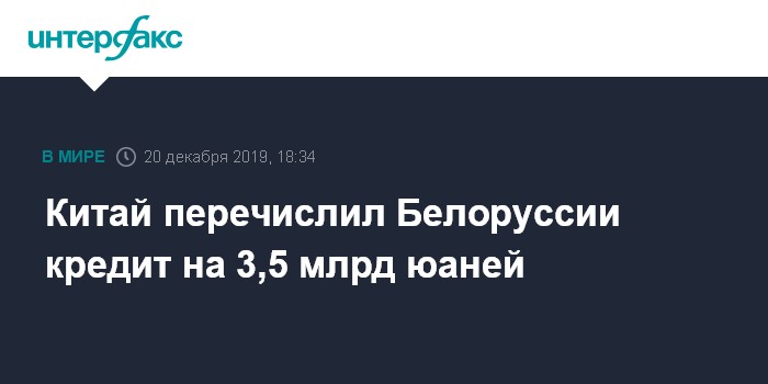 В сообщении белорусского министерства финансов говорится, что 20 декабря в соответствии с условиями соглашения о предоставлении срочного кредита, подписанного 16 декабря 2019 года между Белоруссией и Шанхайским филиалом Банка развития Китая, китайская сторона перечислила Белоруссии средства кредита в сумме 3,5 млрд китайских юаней.