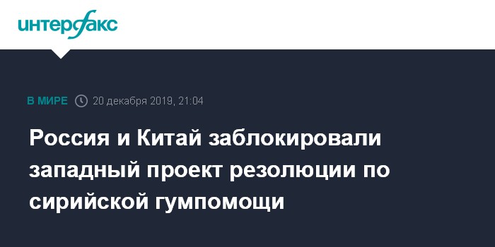 Москва. 20 декабря. INTERFAX.RU - Россия и Китай в пятницу заветировали проект резолюции "гуманитарной тройки" в Совете Безопасности - Бельгии, Германии и Кувейта - о продлении на год трансграничных операций по доставке гуманитарной помощи Сирии.
