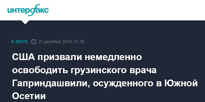 Москва. 21 декабря. INTERFAX.RU - Соединенные Штаты Америки призывают власти Южной Осетии немедленно освободить задержанного в ноябре за нарушение границы грузинского врача Важу Гаприндашвили, озвучило посольство США в Грузии позицию Вашингтона в ночь на субботу.
