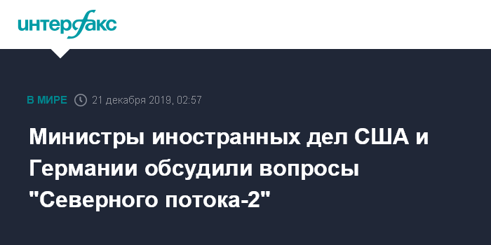 Москва. 21 декабря. INTERFAX.RU - Госсекретарь США Майк Помпео в телефонной беседе с министром иностранных дел Германии Майком Хаасом подтвердил отрицательное отношение Вашингтона к строительству газопровода "Северный поток 2", сообщил американский госдепартамент.