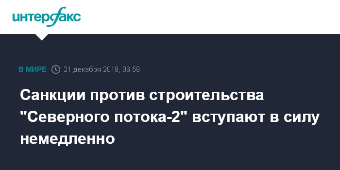 Москва. 21 декабря. INTERFAX.RU - Запрет на строительство "Северного потока 2", прописанный в новом военном бюджете США, вступает в силу немедленно, говорится в специальном разъяснении подразделения Минфина США (OFAC), отвечающего за правоприменение в области санкций.