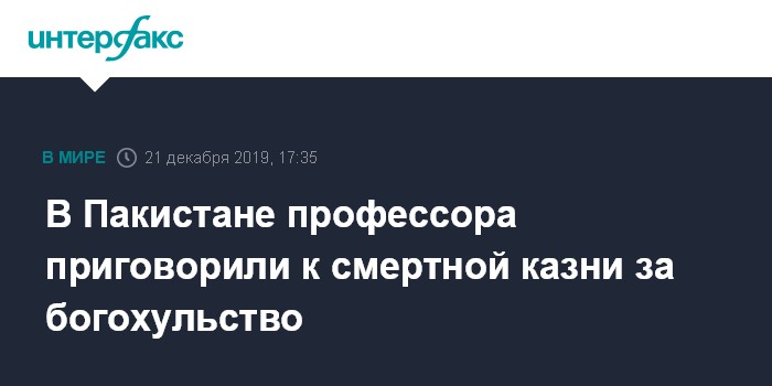 Москва. 21 декабря. INTERFAX.RU - Суд Пакистана признал местного профессора виновным в богохульстве за якобы распространяемые антиисламские идеи. Как сообщает ABC News, Джунаида Хафиза приговорили к смертной казни, а также оштрафовали на $3200.