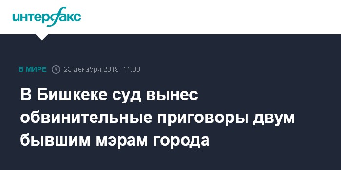 Москва. 23 декабря. INTERFAX.RU - Ленинский районный суд Бишкека приговорил бывшего мэра киргизской столицы Албека Ибраимова к 15 годам лишения свободы, а еще одного бывшего мэра - Кубанычбека Кулматова - оштрафовал на 5 млн сомов ($71 000), и его освободили в зале суда. Оба признаны виновными в коррупции.