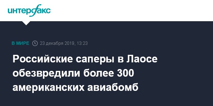 Москва. 23 декабря. INTERFAX.RU - Российские военные, выполняющие гуманитарную миссию по разминированию в Лаосе, за два месяца обезвредили 301 американскую авиабомбу времен Вьетнамской войны, сообщили в департаменте информации и массовых коммуникаций Минобороны РФ.
