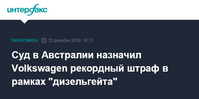 Москва. 23 декабря. INTERFAX.RU - В Австралии суд оштрафовал Volkswagen на рекордную для страны сумму в 125 млн австралийских долларов (77,5 млн евро, $86 млн) в рамках "дизельгейта", сообщает ВВС News.