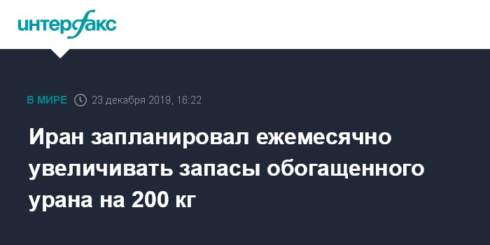 Москва. 23 декабря. INTERFAX.RU - Иран располагает в настоящее время 800 кг обогащенного урана, и каждый месяц его запасы будут увеличиваться примерно на 200 кг, сообщил в понедельник глава Организации по атомной энергии республики Али Акбар Салехи, слова которого приводят иранские СМИ.