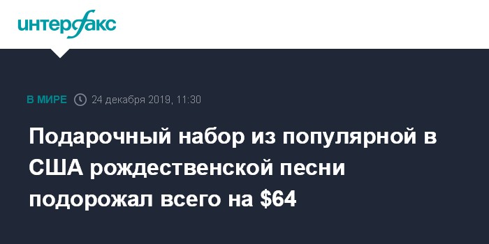 Москва. 24 декабря. INTERFAX.RU - Подарочный набор, составленный на основе популярной в англоязычных странах рождественской песенки "Двенадцать дней Рождества", обойдется американцам в этом году практически в ту же цену, что и в прошлом, свидетельствуют данные PNC Wealth Management.