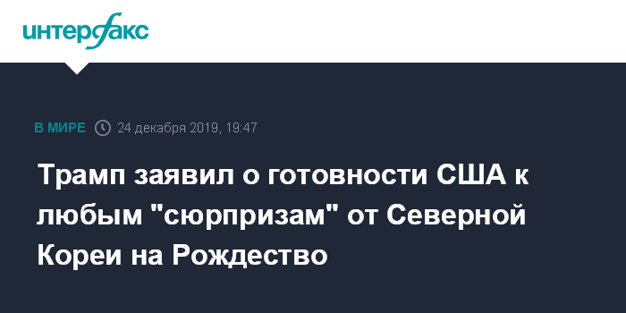 Телеканал CNN ранее сообщал со ссылкой на источник, знакомый с настроениями северокорейского руководства, что Северная Корея планирует принять жесткую политику в отношении США, которая предполагает, в том числе, отказ от переговоров по денуклеаризации. По словам собеседника телеканала, новая политика КНДР в отношении США, вероятно, является так называемым "рождественским подарком", который Пхеньян обещал преподнести Вашингтону.