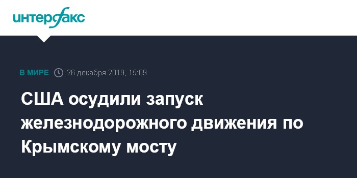 Москва. 26 декабря. INTERFAX.RU - Посольство США на Украине называет запуск железнодорожного сообщения по мосту между РФ и Крымом демонстрацией "вопиющего неуважения" к суверенитету и территориальной целостности Украины.