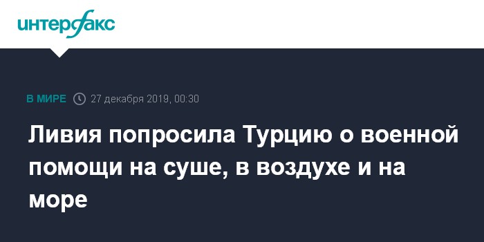 Москва. 27 декабря. INTERFAX.RU - Правительство национального согласия Ливии официально попросило Турцию об оказании военной помощи для обороны Триполи, сообщает газета "Дейли сабах".