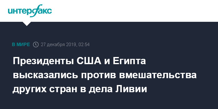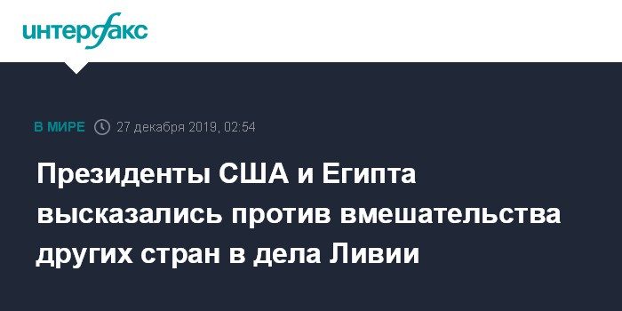 Москва. 27 декабря. INTERFAX.RU - Президент США Дональд Трамп и глава Египта Абдель Фаттах ас-Сиси в ходе состоявшейся телефонной беседы высказались против иностранного вмешательства во внутриполитический ливийский конфликт, сообщил Белый дом.
