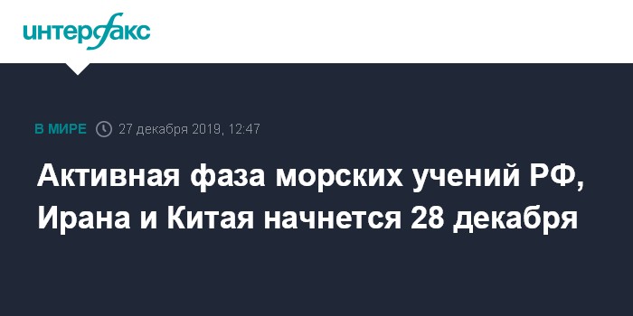 Москва. 27 декабря. INTERFAX.RU - Активная фаза совместных военно-морских учений России, Ирана и Китая в северной части Индийского океана стартует в субботу, 28 декабря, сообщили "Интерфаксу" в пресс-службе Балтийского флота.