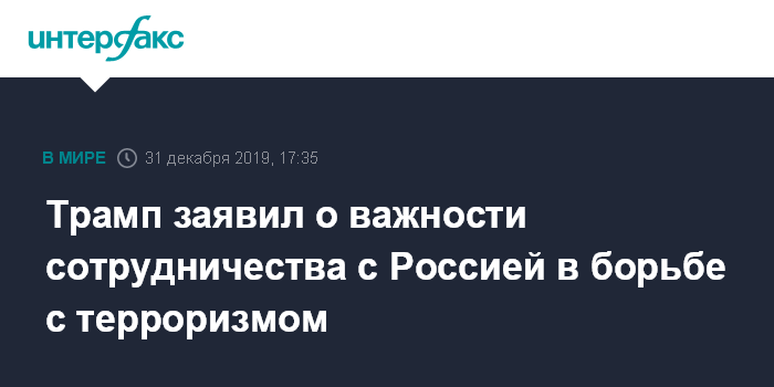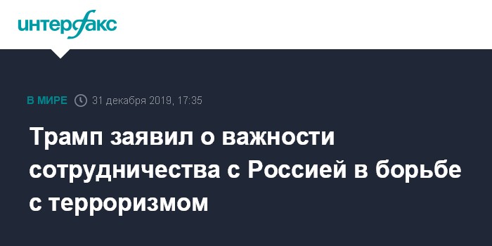 Москва. 31 декабря. INTERFAX.RU - Президент США Дональд Трамп вспомнил во вторник о предотвращенном при помощи Вашингтона теракте в Санкт-Петербурге и подчеркнул важность такого рода сотрудничества с РФ.