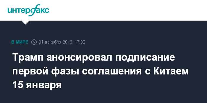 Москва. 31 декабря. INTERFAX.RU - Президент США Дональд Трамп заявил, что намерен 15 января подписать первую фазу торгового соглашения между его страной и КНР.