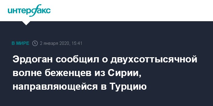 Москва. 2 января. INTERFAX.RU - Более 200 тыс. сирийцев в настоящее время направляются в сторону турецкой границы, спасаясь от ситуации в Идлибе, сообщает в четверг газета Hürriyet со ссылкой на президента Турции Реджепа Тайипа Эрдогана.