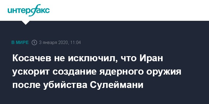 Косачев не исключил, что Иран ускорит создание ядерного оружия после убийства Сулеймани