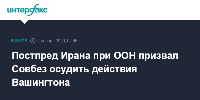 Москва. 4 января. INTERFAX.RU - После убийства американцами командира иранского спецподразделения "Кудс" Касема Сулеймани, "являющимся ужасающим преступлением", Иран оставляет за собой право на самооборону, заявил постпред Ирана при ООН Маджид Тахт-Раванчи.