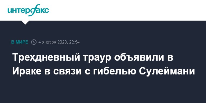 Дубай. 4 января. INTERFAX.RU - Правительство Ирака объявило о трехдневном трауре в связи с гибелью на этой неделе командующего иранского спецподразделения "Кудс" Касема Сулеймани и одного из командиров иракского шиитского ополчения, сообщают западные СМИ.