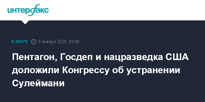 Представители ведомств доложили конгрессменам о "недавних решительных оборонительных действиях, предпринятых для защиты американского персонала за рубежом", в том числе о "ликвидации командира подразделения "Кудс" Касема Сулеймани".