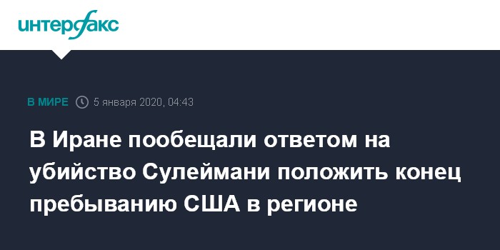 Как сообщалось, генерал Сулеймани погиб при целевом ракетном обстреле американскими ВВС международного аэропорта Багдада в ночь на 3 января. Операция по его ликвидации в Ираке была подготовлена и проведена по указанию президента Дональда Трампа.