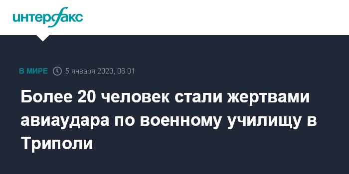 Москва. 5 января. INTERFAX.RU - В результате авиаудара по зданию военного училища в Триполи погибли не менее 23 человек, десятки получили ранения, сообщило министерство здравоохранения признанного ООН ливийского правительства национального согласия (ПНС).