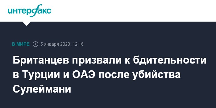 "После смерти иранского генерала Касема Сулеймани... британские подданные в этом регионе (Турции - ИФ) должны сохранять бдительность и быть в курсе последних событий", - сказали в ведомстве.