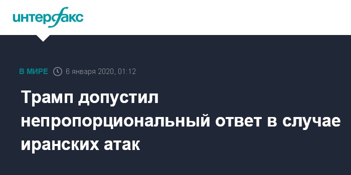 Москва. 6 января. INTERFAX.RU - США готовы к быстрому и, возможно, непропорциональному ответу, если Иран будет атаковать американские объекты, заявил президент США Дональд Трамп.
